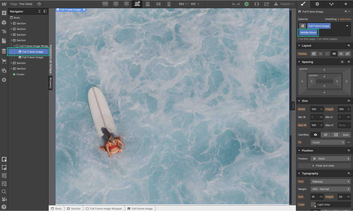 Con l'uso di queste classi globali si ha un controllo completo sull'esperienza desktop vs. mobile. È particolarmente vantaggioso utilizzarle avere l'elemento Full Frame Image per desktop e mobile adattato alle tue esigenze.