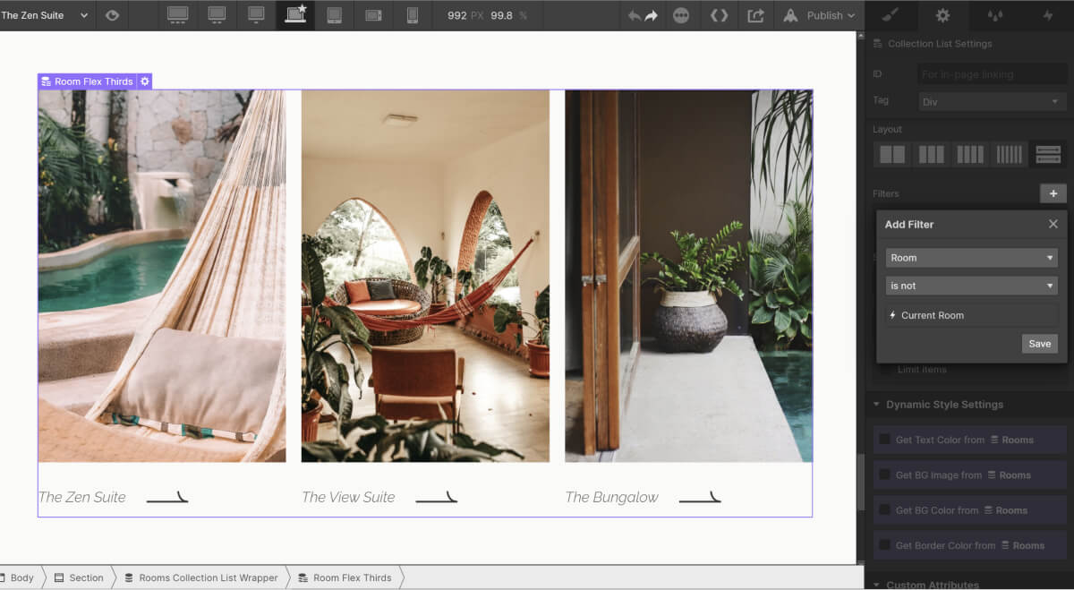 Attualmente il CMS contiene solo 3 camere. Ciò significa che nell'ultima sezione di ogni stanza, dove l'utente può continuare ad esplorare altre stanze, verrà visualizzata anche la stanza attuale. Una volta che verranno aggiunte più di 3 stanze nel template, sarà necessario filtrare la stanza corrente dalla lista per evitare che venga visualizzata lì.