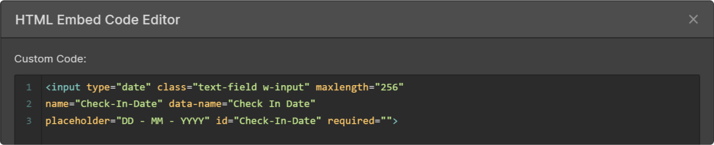 Questo template ha un form che permette all'utente di inserire la data di check-in e di check-out. Puoi collegarlo a un software di prenotazione esterno di tua scelta. Se vuoi che venga visualizzato un calendario per i campi 'Check-in' e 'Check-out', devi aggiungerlo mediante un embed code, dove c'è scritto <input type="date">.