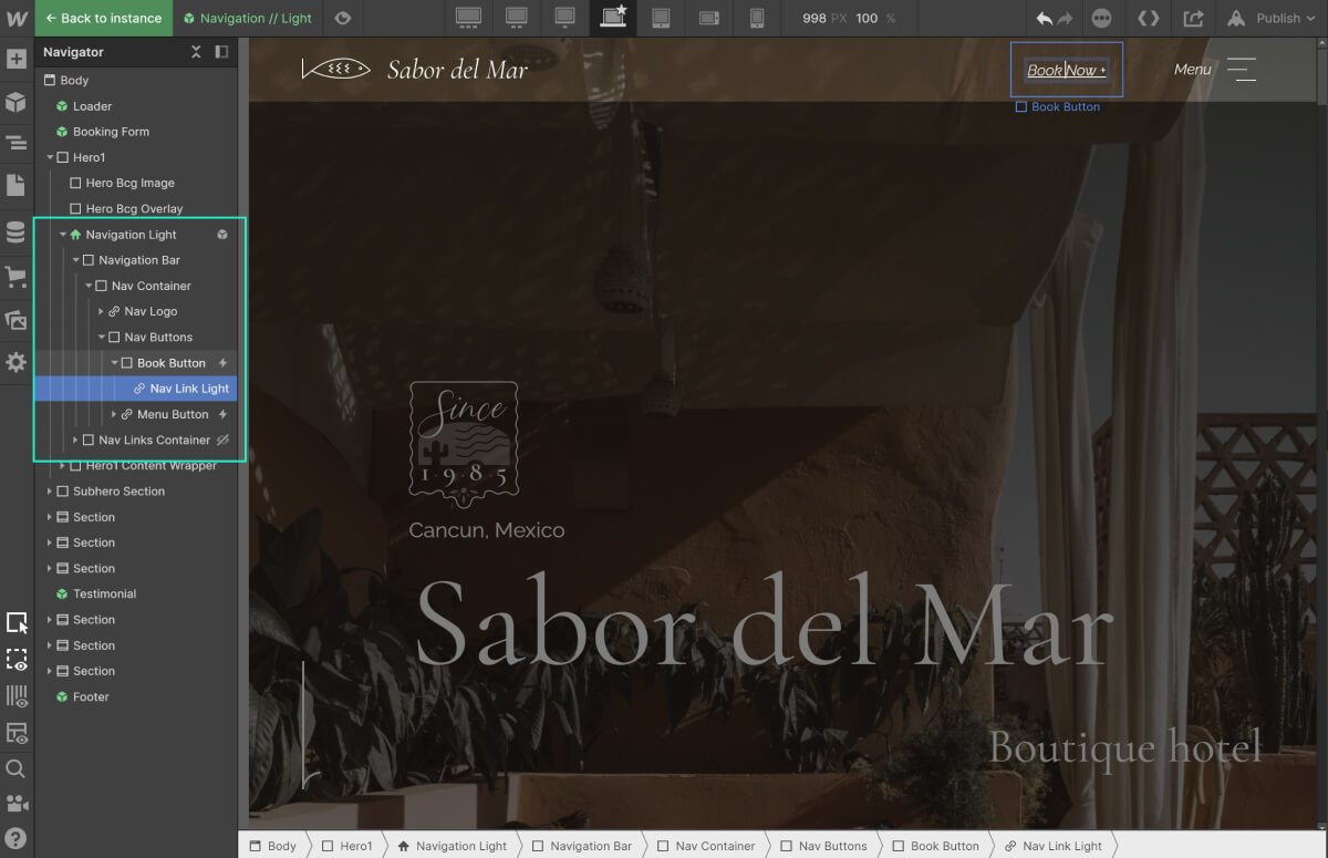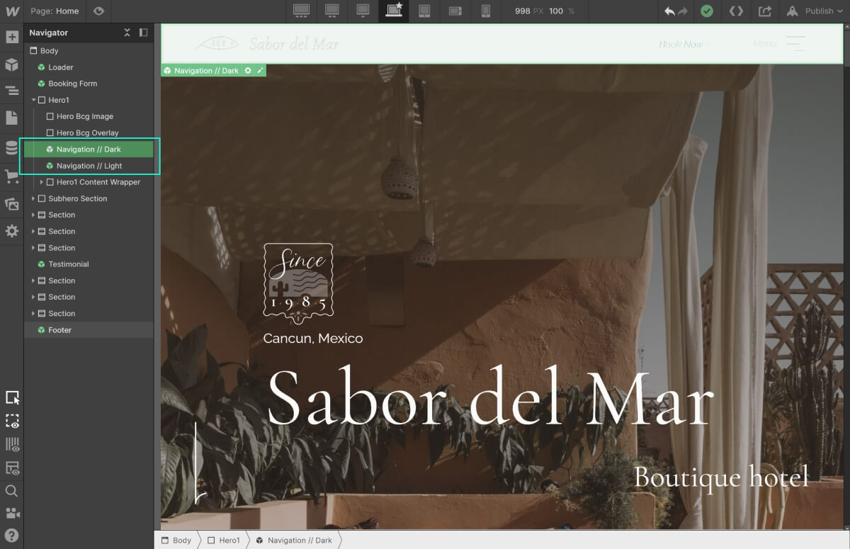 Ci sono due tipi di "Navigation bar": light e dark. Entrambe sono simboli, il che significa che una volta modificate, le modifiche saranno applicate a tutte le barre di navigazione presenti nelle varie pagine del template.